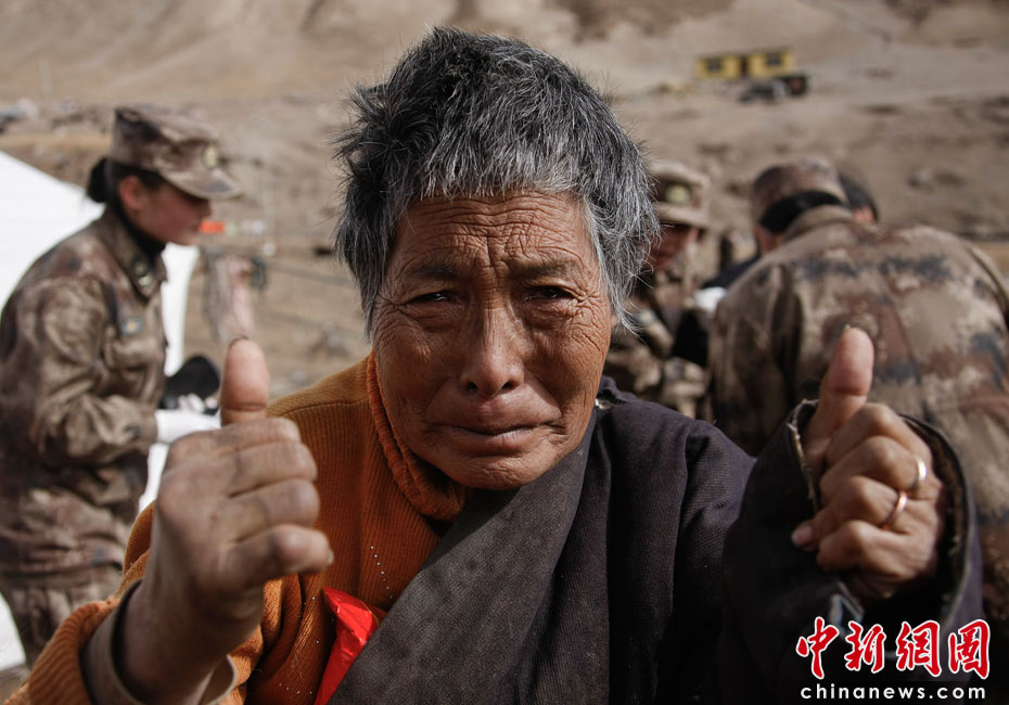 4月18日,總后青藏兵站部抗震醫(yī)療隊(duì)在青海玉樹震中結(jié)古鎮(zhèn)展開救援的同時(shí),還派員向周邊牧區(qū)巡診,救治傷病員。圖為黃林格頭牧區(qū)78歲的旦樣老阿媽熱淚盈眶地向醫(yī)務(wù)人員豎起大了拇指。中新社發(fā) 鄒小慶 攝