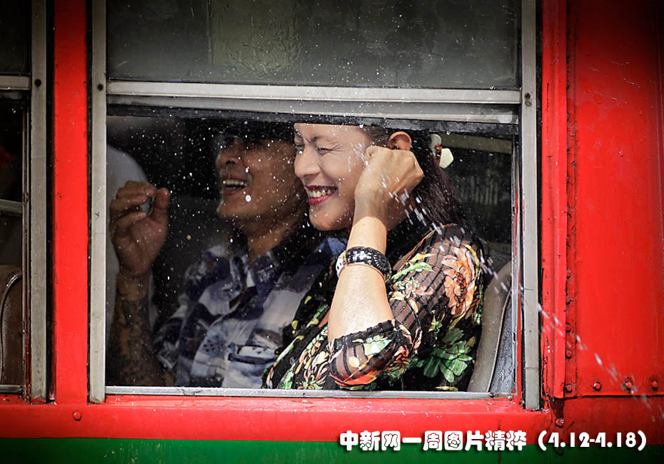 4月14日周三,在泰國曼谷舉行的泰國新年慶;顒(dòng)中,巴士上的乘客被窗外射來的水擊中。