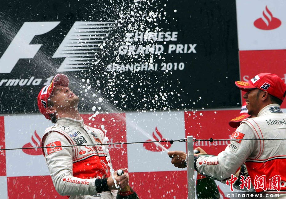 圖為伯頓與隊(duì)友漢密爾頓開香檳祝賀。中新社記者 任晨鳴 攝