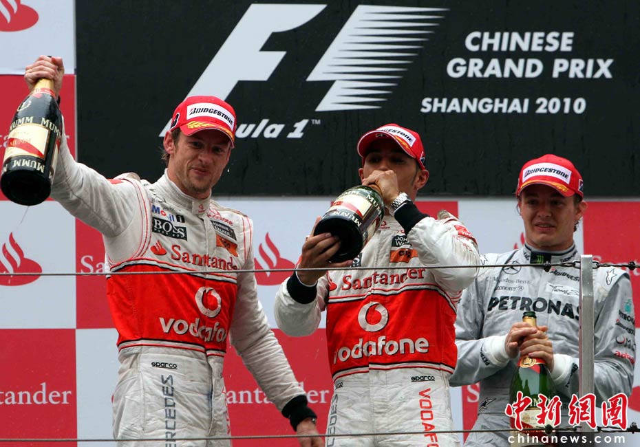 4月18日下午,2010國際汽聯(lián)F1世界錦標(biāo)賽上海站在上海國際賽車場舉行正式比賽,邁凱輪車隊(duì)的英國車手巴頓(左)在雨中獲得冠軍、隊(duì)友、英國車手漢密爾頓(中)獲得亞軍,梅賽德斯GP車隊(duì)的德國車手羅斯伯格獲得季軍。中新社記者 任晨鳴 攝