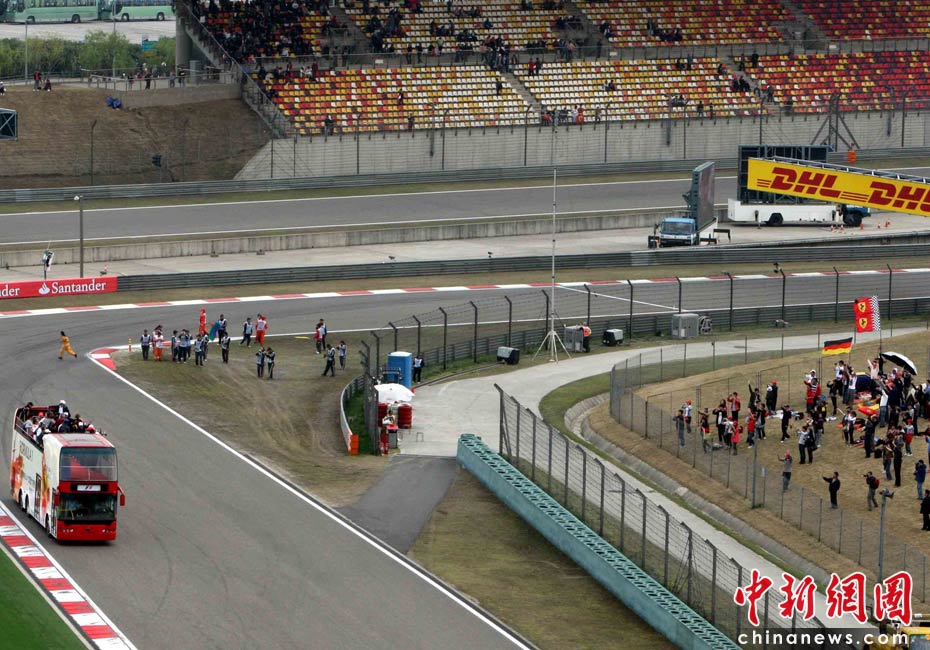 4月18日下午,2010國(guó)際汽聯(lián)F1世界錦標(biāo)賽上海站在上海國(guó)際賽車場(chǎng)舉行正式比賽,賽前24名參賽車手按照慣例乘坐敞篷車環(huán)繞賽場(chǎng)一周與車迷見(jiàn)面,但是寥寥無(wú)幾的觀眾與陰沉的天氣使上海F1賽事創(chuàng)下開賽七年以來(lái)觀眾人數(shù)最低的紀(jì)錄。中新社記者 任晨鳴 攝