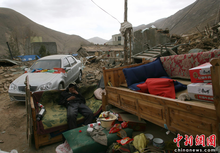 4月18日,玉樹(shù)結(jié)古鎮(zhèn)一男孩在家中的“客廳”上休息。地震后,他們將必需的起居用品搬到戶外。中新社發(fā) 蘇丹 攝