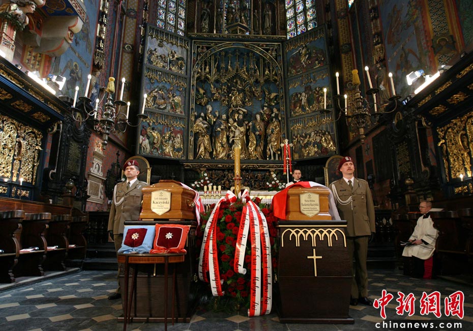 當(dāng)?shù)貢r(shí)間4月18日,卡欽斯基夫婦的葬禮在波蘭南部城市克拉科夫舉行。波蘭總統(tǒng)卡欽斯基及其夫人乘坐的專機(jī)10日在俄羅斯斯摩棱斯克失事,機(jī)上人員全部遇難。圖片來源:中國(guó)新聞網(wǎng)