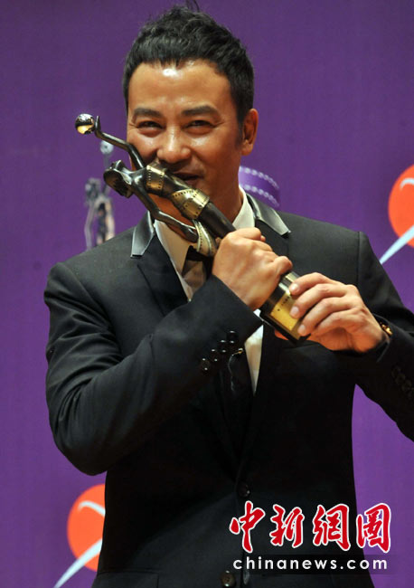 4月18日晚,“第二十九屆香港電影金像獎(jiǎng)”頒獎(jiǎng)典禮在香港文化中心大劇院隆重舉行,影星任達(dá)華憑演出電影「歲月神偷」奪得最佳男主角獎(jiǎng)項(xiàng)。圖為任達(dá)華親吻最佳男主角獎(jiǎng)項(xiàng)。中新社發(fā) 鄧慶樂 攝