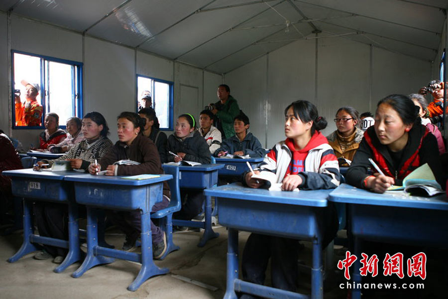 4月18日,70多名孩子在地震四天后重新走進(jìn)了課堂,玉樹(shù)州孤兒學(xué)校成為了地震災(zāi)區(qū)第一所復(fù)課的學(xué)校,剛完成帳篷搭建的青海省玉樹(shù)藏族自治州第一民族中學(xué)3個(gè)年級(jí)的學(xué)生也開(kāi)始復(fù)課。青友 攝