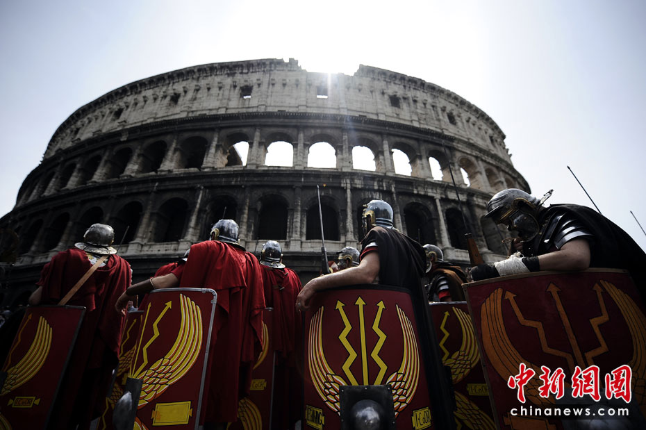 4月18日,意大利羅馬,男子打扮成武士在圓形競(jìng)技場(chǎng)附近參加游行,慶祝羅馬建城2763周年。圖片來源:中國新聞網(wǎng)