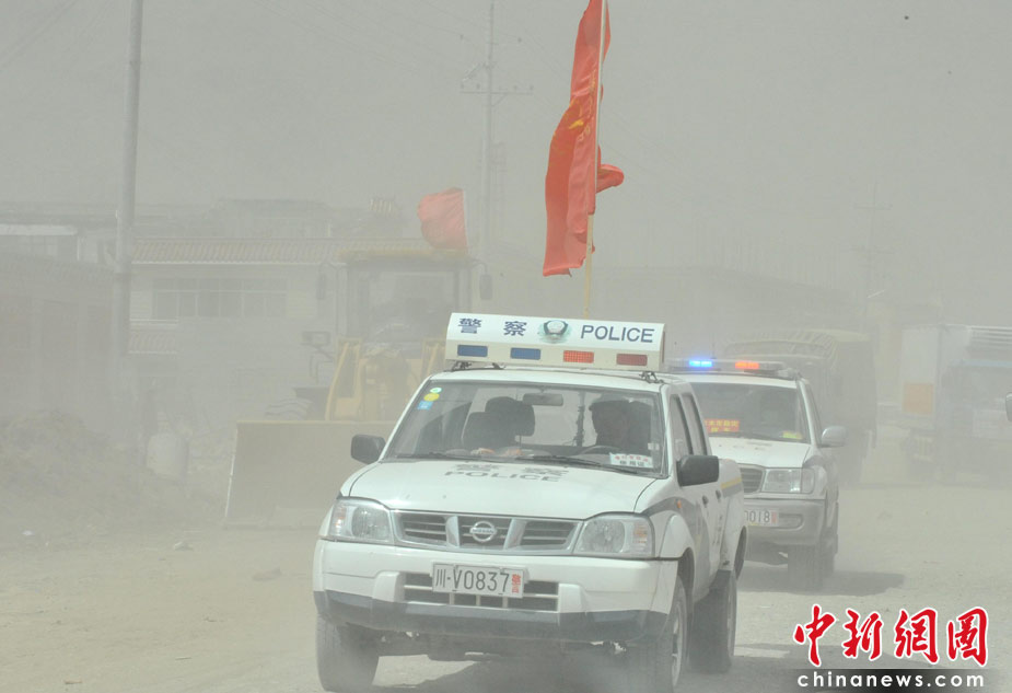 4月中旬青海玉樹地震災(zāi)區(qū)風(fēng)沙迷漫,警車在結(jié)古鎮(zhèn)災(zāi)區(qū)風(fēng)煙滾滾中艱難穿行。中新社發(fā) 賈國(guó)榮 攝
