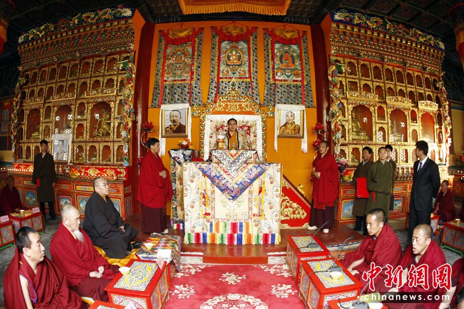 4月20日上午9時許,十一世班禪額爾德尼·確吉杰布在北京西黃寺,為青海玉樹地震遇難同胞舉行超度法會。中新社發(fā) 杜洋 攝