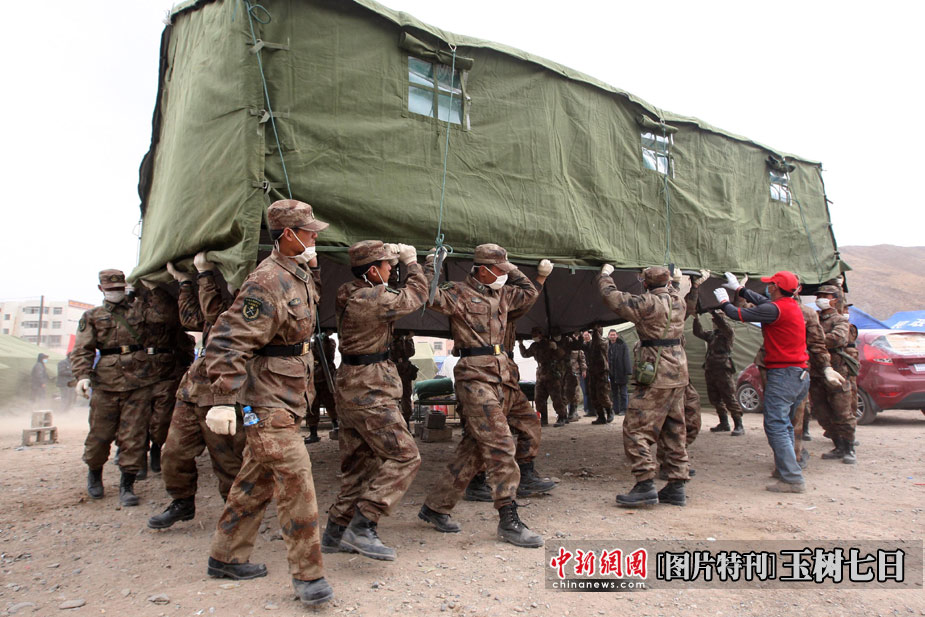 4月17日,青海玉樹體育場(chǎng)受災(zāi)民眾安置點(diǎn)內(nèi),解放軍救援隊(duì)為安置點(diǎn)整體搬遷帳篷。中新社發(fā) 盛佳鵬 攝