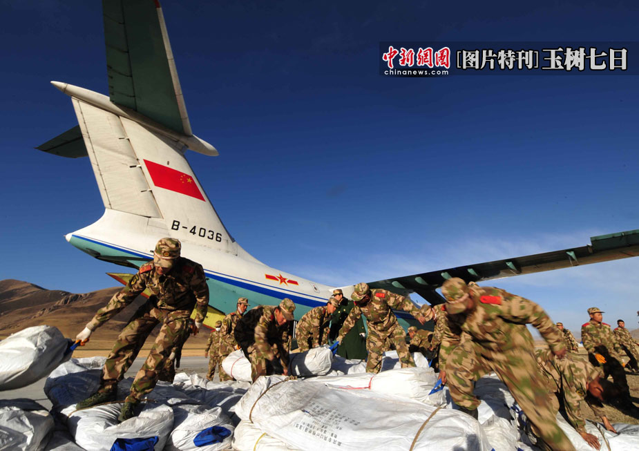 4月17日凌晨6點(diǎn)開(kāi)始,空軍緊急出動(dòng)飛機(jī)8架,飛行8架次,截止到中午12點(diǎn),共運(yùn)送帳篷1080頂,救災(zāi)器材20噸,野戰(zhàn)食品24噸,共計(jì)158噸。據(jù)玉樹氣象臺(tái)預(yù)報(bào),災(zāi)區(qū)當(dāng)日下午到夜間有陣雨,19日白天至夜間有小到中雪,氣溫將降到零度以下。中新社發(fā) 沈玲 攝