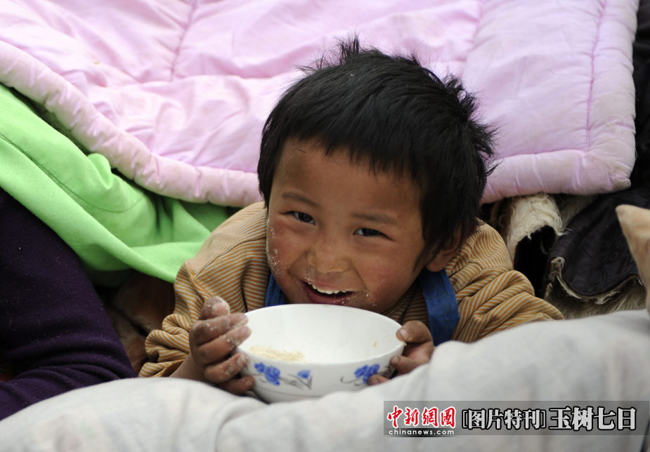 災(zāi)難的來(lái)臨無(wú)法選擇,但是面對(duì)災(zāi)難的方式,卻始終掌握在每個(gè)人自己手中。家園被毀,失去親人,傷痛過(guò)后生活還要繼續(xù),愿玉樹的受災(zāi)群眾選擇堅(jiān)強(qiáng),用堅(jiān)韌和信心去開創(chuàng)新的生活。 圖為青海玉樹體育場(chǎng)地震民眾安置點(diǎn),一名孩童歡快地吃東西。中新社發(fā) 廖攀 攝
