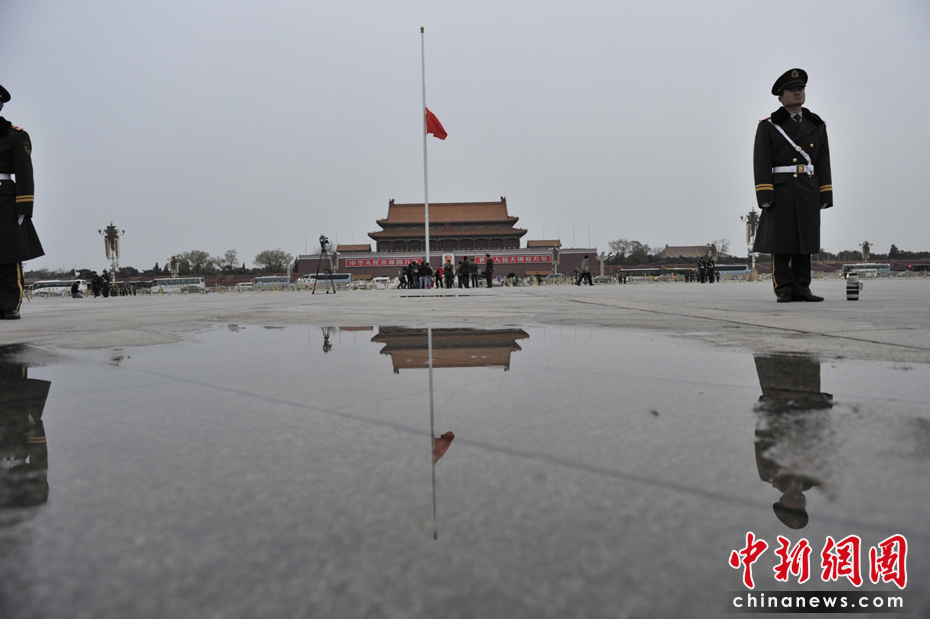 4月21日早晨,北京天安門廣場下半旗向玉樹地震遇難者致哀。中新網(wǎng)記者 金碩 攝