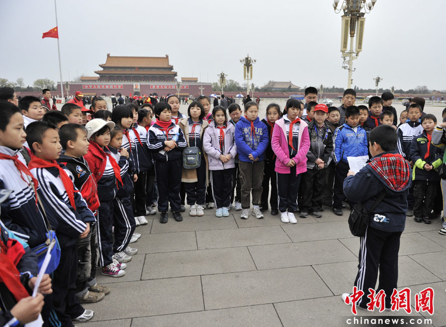 4月21日清晨,廊坊第十二小學(xué)的小學(xué)生來(lái)到天安門廣場(chǎng)朗讀自己的作文悼念青海玉樹地震的遇難同胞。中新網(wǎng)記者 金碩 攝