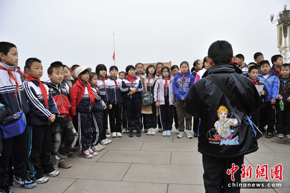 4月21日清晨,廊坊第十二小學(xué)的小學(xué)生來(lái)到天安門(mén)廣場(chǎng)朗讀自己的作文悼念青海玉樹(shù)地震的遇難同胞。中新網(wǎng)記者 金碩 攝