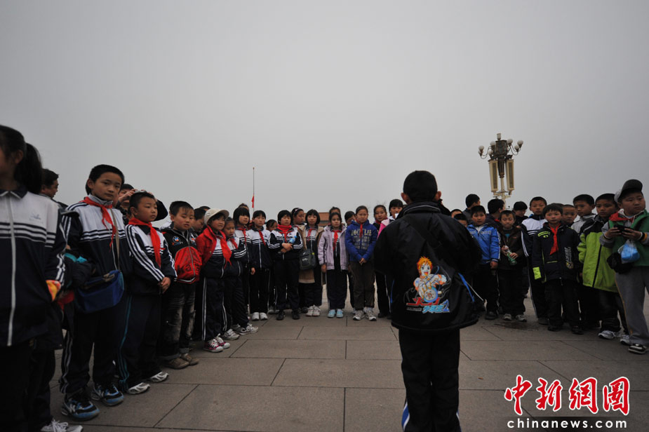 4月21日清晨,廊坊第十二小學(xué)的小學(xué)生來到天安門廣場(chǎng)朗讀自己的作文悼念青海玉樹地震的遇難同胞。中新網(wǎng)記者 金碩 攝
