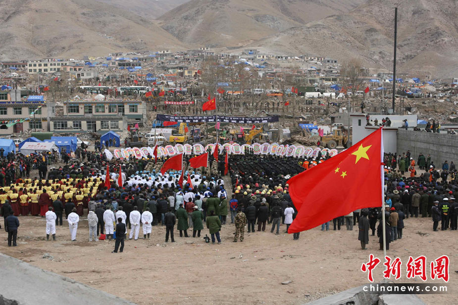 4月21日,為表達全國各族人民對青海玉樹地震遇難同胞的深切哀悼,中國國務(wù)院決定,舉行全國哀悼活動。圖為青海玉樹當(dāng)?shù)孛癖娫谟駱淇h結(jié)古鎮(zhèn)鎮(zhèn)政府舉行哀悼活動。中新社發(fā) 蘇丹 攝