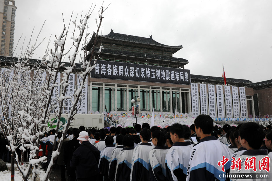 21日上午9時(shí)許,西寧各界民眾冒雪陸續(xù)來(lái)到該市最大的廣場(chǎng)——新寧廣場(chǎng),悼念玉樹(shù)地震遇難同胞。中新社記者 符永康 攝