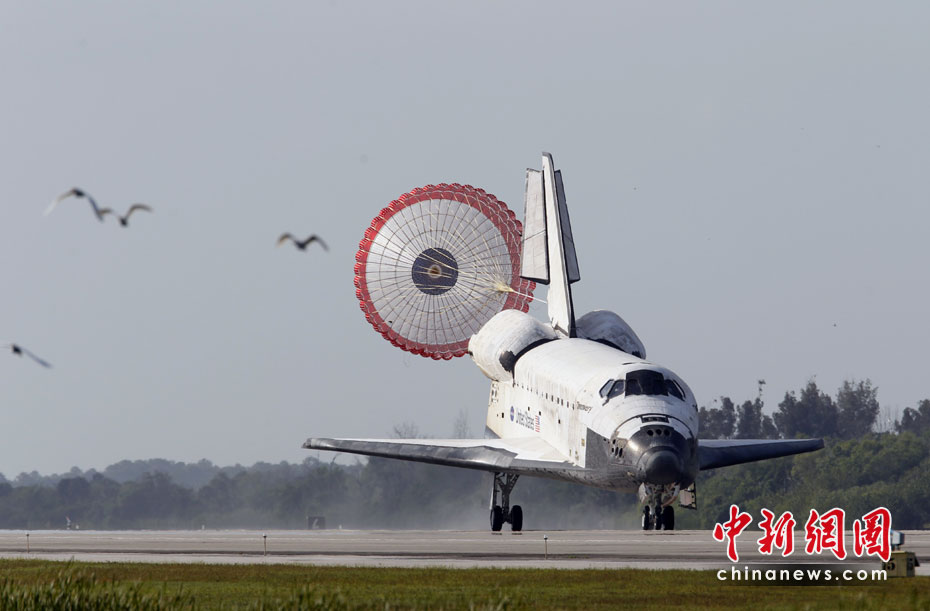 美國發(fā)現(xiàn)號航天飛機于當?shù)貢r間4月20日成功降落在佛羅里達州肯尼迪航天中心,結(jié)束了為期15天的國際空間站建設(shè)之旅。圖片來源:中國新聞網(wǎng)