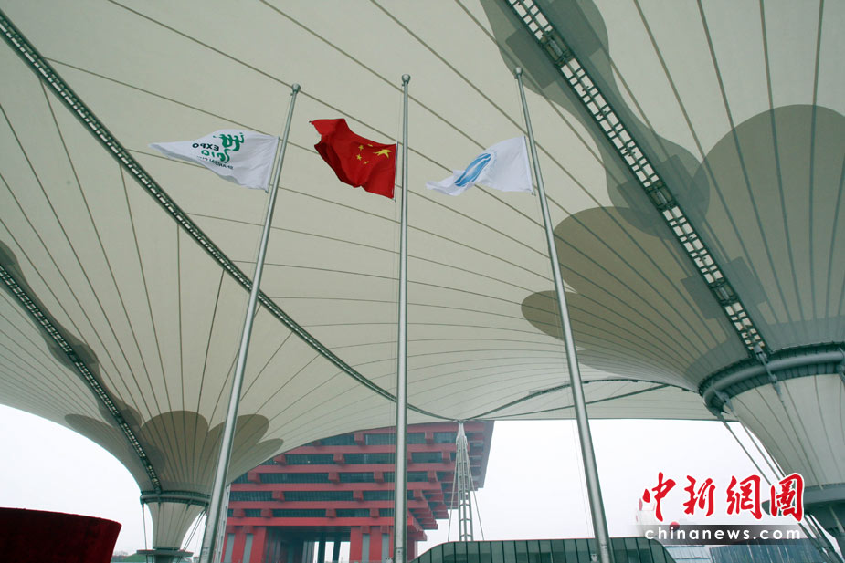 4月21日,上海世博園區(qū)降半旗哀悼玉樹地震遇難者。當日,全國舉行哀悼活動,深切哀悼青海玉樹地震遇難同胞。中新社發(fā) 湯彥俊 攝