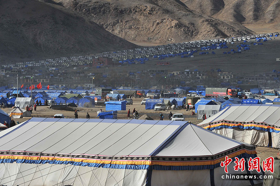 國(guó)家民政緊急救援的帳篷4月21日繼續(xù)在青海玉樹(shù)地震災(zāi)區(qū)發(fā)放,結(jié)古鎮(zhèn)周圍廢墟危房區(qū)已經(jīng)出現(xiàn)救災(zāi)帳篷新城。中新社發(fā) 賈國(guó)榮 攝
