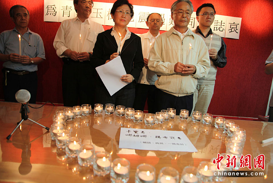 4月21日晚7時,中國統(tǒng)一聯(lián)盟在臺北以點燃蠟燭、3分鐘默哀、宣讀哀悼文等形式,與大陸同胞一起哀悼玉樹強震罹難者。前左為“統(tǒng)盟”主席紀(jì)欣,前右為勞動黨主席吳榮元。中新社發(fā) 董會峰 攝