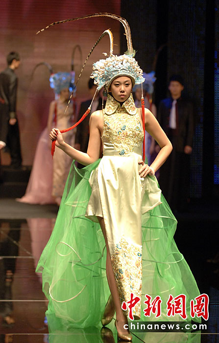4月20日晚,首屆海西國際時裝周在福建石獅閉幕,本屆時裝周吸引了來自海峽兩岸的紡織服裝界企業(yè)家和知名服裝設計師。期間舉辦了12場時裝品牌和設計師作品動態(tài)發(fā)布會。圖為模特展示古今潮流結合的服裝。王東明 攝