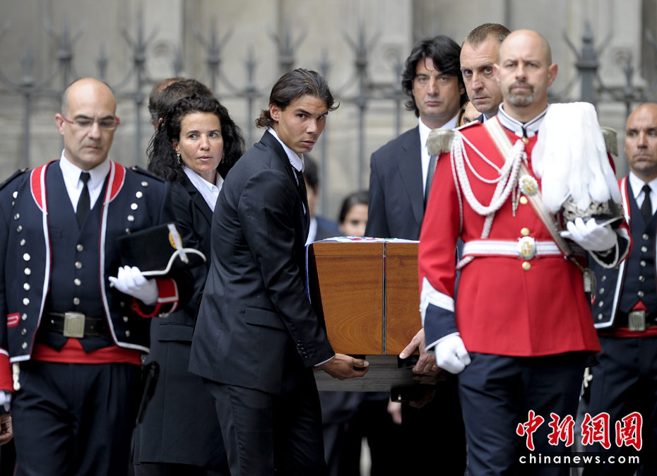 西班牙當地時間4月22日18時,國際奧委會終身名譽主席薩馬蘭奇的葬禮在巴塞羅那舉行,包括西班牙國王夫婦、現任國際奧委會主席羅格、F1車手阿隆索、巴薩俱樂部主席等在內的政界和體育界4000多人出席,網球名將納達爾等負責抬靈柩,送別薩翁最后一程。 圖為西班牙網球明星納達爾忍悲痛抬棺木。