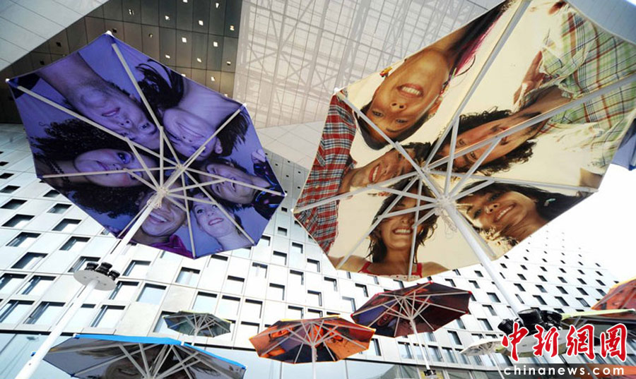 2010年4月22日,上海世博會(huì)主題館門前的觀眾等候區(qū),豎立著一把把遮陽(yáng)的花傘,每一把花傘上都印著四方友人的燦爛微笑。世博園區(qū)為了應(yīng)對(duì)大量客流,園區(qū)設(shè)置了大量遮陽(yáng)和避雨設(shè)施,遮陽(yáng)避雨面積總量達(dá)40萬(wàn)平方米。楊毅 攝
