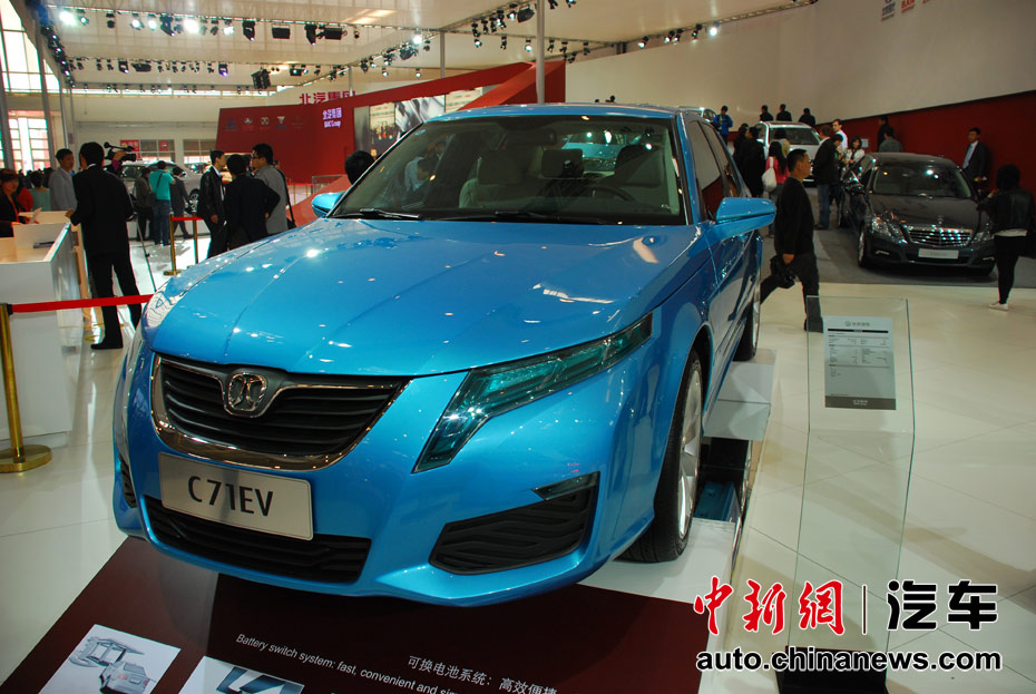 第十一屆北京國際車展23日開幕,在本屆以“暢想綠色未來”為主題的車展上,新能源車成為最大亮點。圖為北汽C71EV電動車 王槊 攝
