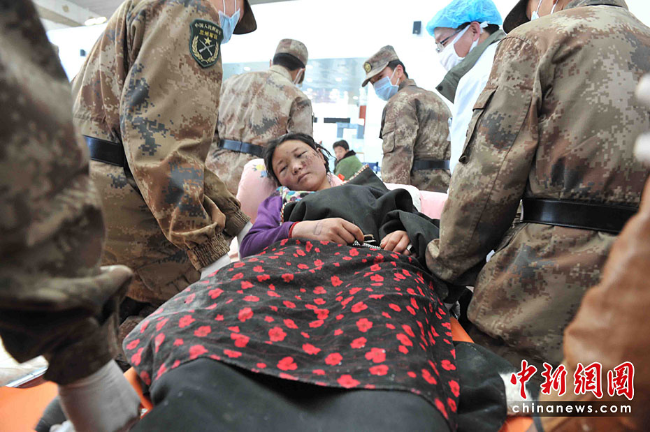 記者組隨救災(zāi)帳篷一起卸下,快速進(jìn)入機(jī)場(chǎng)大廳,只見滿地躺著亟待救治的重傷員,還有多位因高原反應(yīng)強(qiáng)烈而輸液撤離的救援隊(duì)員。