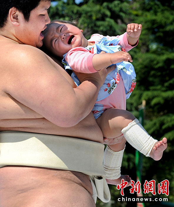 4月25日,日本東京,幾名相撲手手抱嬰兒,正努力使嬰兒哭泣。當日,一年一度的日本一周歲以下嬰兒啼哭大賽在東京淺草寺舉行。第一個讓嬰兒哭泣的選手將贏得比賽,日本通過此種比賽為孩子的健康祈福,他們認為嬰兒哭泣將對他們將來的身體健康有利。圖片來源:中國新聞網(wǎng)