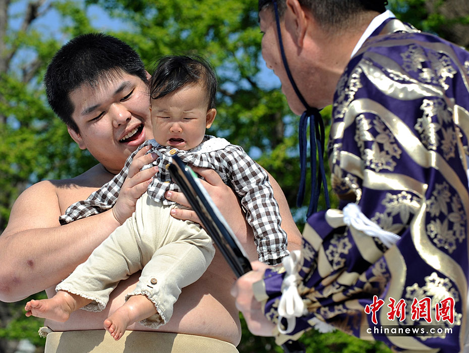 4月25日,日本東京,幾名相撲手手抱嬰兒,正努力使嬰兒哭泣。當日,一年一度的日本一周歲以下嬰兒啼哭大賽在東京淺草寺舉行。第一個讓嬰兒哭泣的選手將贏得比賽,日本通過此種比賽為孩子的健康祈福,他們認為嬰兒哭泣將對他們將來的身體健康有利。圖片來源:中國新聞網(wǎng)