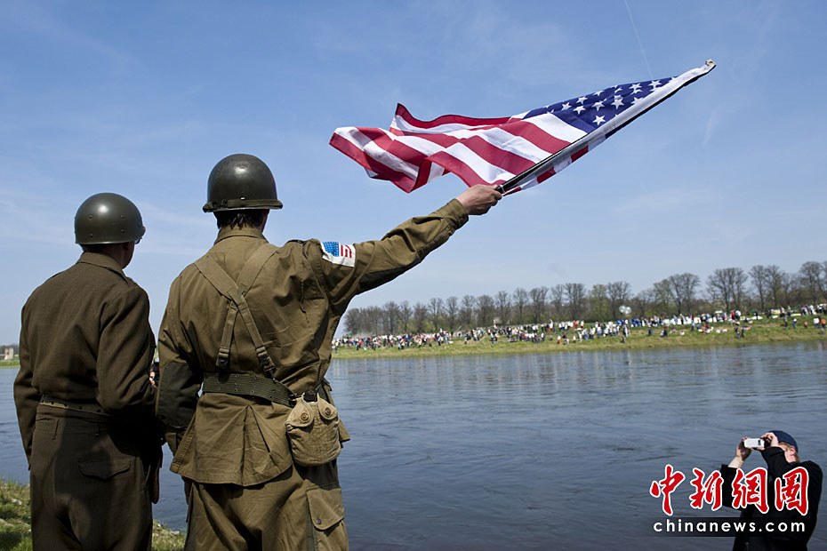 德國當(dāng)?shù)貢r間4月24日,演員身著二戰(zhàn)時期美蘇軍裝在德國托爾高南部易北河畔的一座小橋上重現(xiàn)當(dāng)年的“會師”一幕。