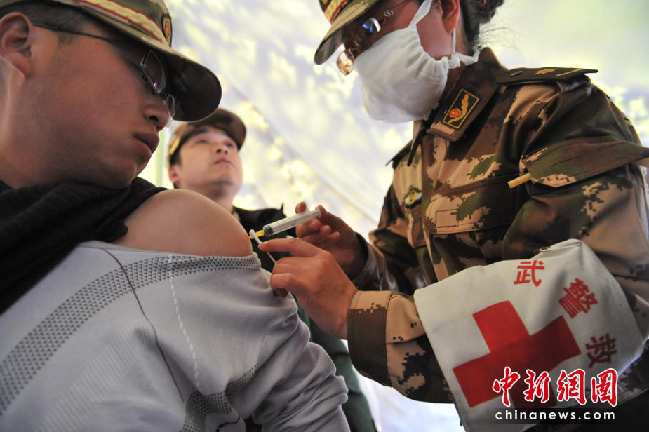 武警青海總隊(duì)醫(yī)院救護(hù)隊(duì)半夜為受傷的士兵補(bǔ)打疫苗。4月下旬的玉樹地震災(zāi)區(qū)急缺防疫藥品,中新社發(fā) 賈國(guó)榮 攝