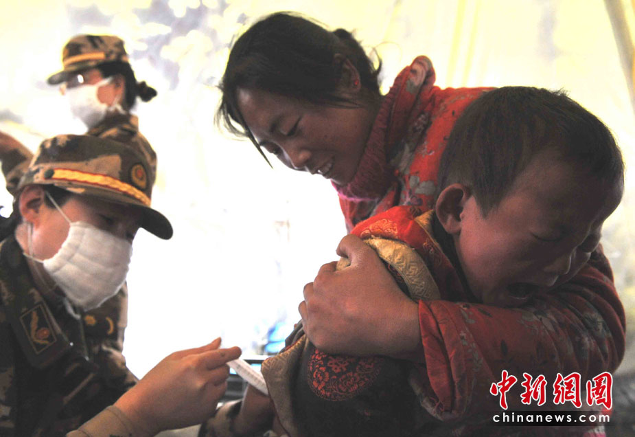 武警青?傟犛駱渲ш犑亲钕韧度肟拐鹁葹(zāi)的先鋒部隊,地震發(fā)生時恰逢部隊出操,營房嚴重受損而官兵平安無恙。這里立即成為抗震救災(zāi)的軍民和媒體的大本營之一,醫(yī)療救護隊和新型炊事車晝夜為軍民服務(wù)。集結(jié)在地震災(zāi)區(qū)的各路部隊從4月低之前全面轉(zhuǎn)入安置群眾和災(zāi)后重建,這里的的后勤已經(jīng)得到基本保障。 圖為醫(yī)療隊軍醫(yī)為受災(zāi)民眾治療。 中新社記者 賈國榮 攝