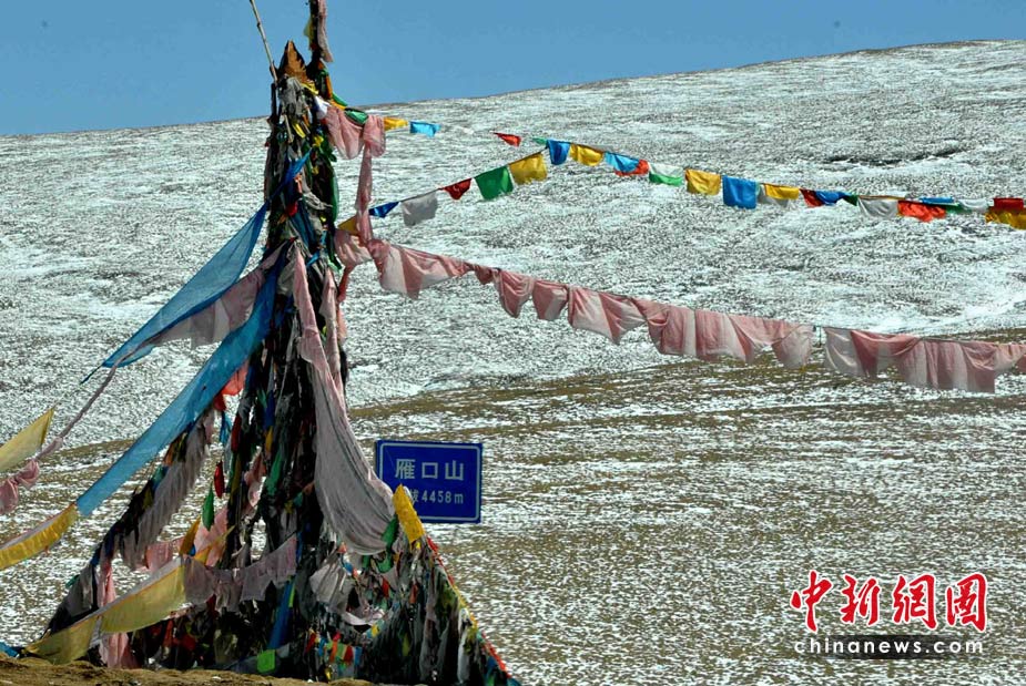 屬于長江、黃河、瀾滄江三江源地區(qū)的青海玉樹地震災(zāi)區(qū),自然保護(hù)區(qū)的18個(gè)核心區(qū)域中,有10個(gè)位于玉樹州境內(nèi),占總面積的72%。4月下旬,記者深入災(zāi)區(qū)縱深各地,災(zāi)后重建正面臨保護(hù)生態(tài)環(huán)境、為三江源建起一道生態(tài)屏障的難題;近日緊迫的防疫工作,必須使用滅菌效果好、對(duì)環(huán)境無污染的消毒劑。圖為高原山口的經(jīng)幡依舊。中新社記者 賈國榮攝