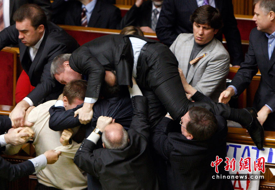 4月27日,基輔,烏克蘭議會(huì)就俄羅斯黑海艦隊(duì)駐扎問題進(jìn)行討論時(shí)出現(xiàn)混亂,數(shù)千人在議會(huì)外示威,會(huì)場(chǎng)內(nèi)有人投擲煙霧彈和雞蛋,大廳內(nèi)煙霧彌漫,場(chǎng)面一度混亂。