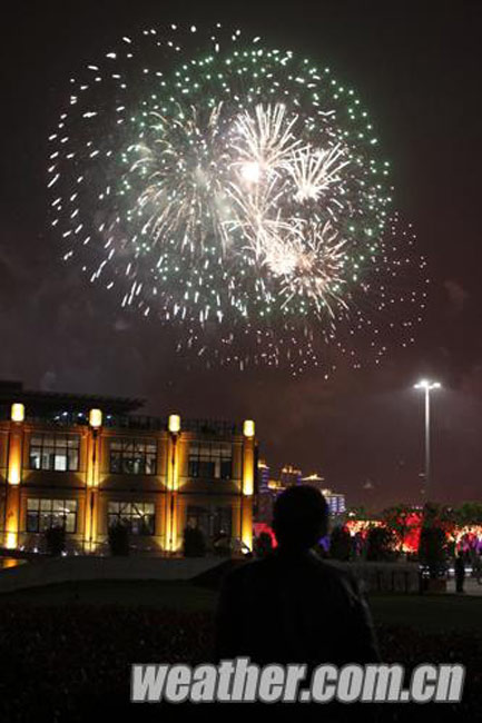 2010年4月27日,上海世博會(huì)開(kāi)幕式彩排順利進(jìn)行。圖為煙花精彩,駐足觀賞。卞赟 攝