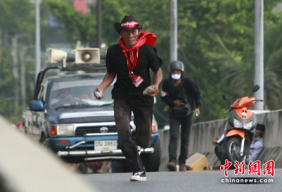 泰國防暴警察與紅衫軍示威民眾28日下午爆發(fā)沖突,1名士兵頭部被擊中身受重傷,10名示威民眾受傷送醫(yī)。