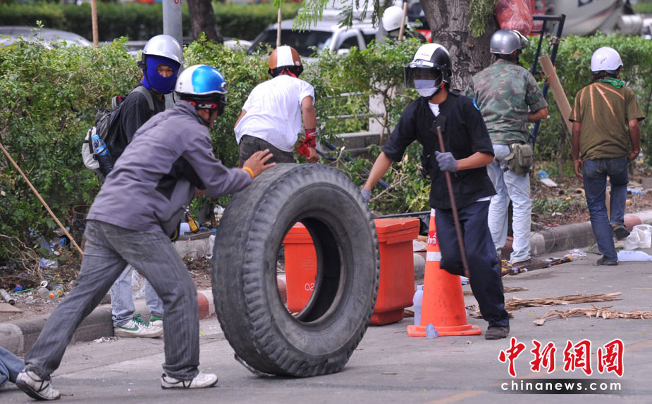 泰國防暴警察與紅衫軍示威民眾28日下午爆發(fā)沖突,1名士兵頭部被擊中身受重傷,10名示威民眾受傷送醫(yī)。