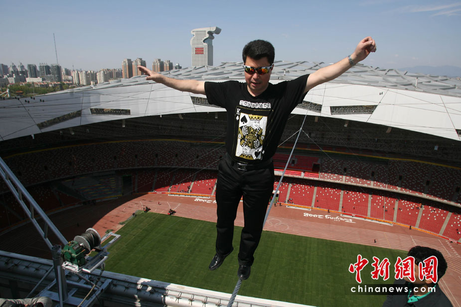 4月29日,有高空王子之稱的新疆小伙阿迪力在鳥(niǎo)巢上空成功試演達(dá)瓦孜(高空走鋼絲)。5月3日起,他將在北京國(guó)家體育場(chǎng)(鳥(niǎo)巢)頂棚上搭建的小屋生存60天,其間每天將進(jìn)行約5個(gè)小時(shí)的高空走鋼絲表演。 中新社發(fā) 蘇丹 攝