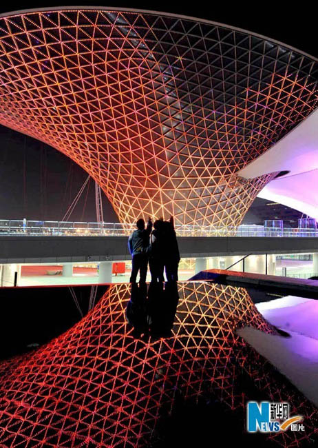 靜待開幕的世博園沉浸在一片暮色中,流光溢彩,給人無限遐想。從外灘到世博園,“夜”上海不斷延伸,讓人激情跳躍。圖片來源:新華網孫巍攝