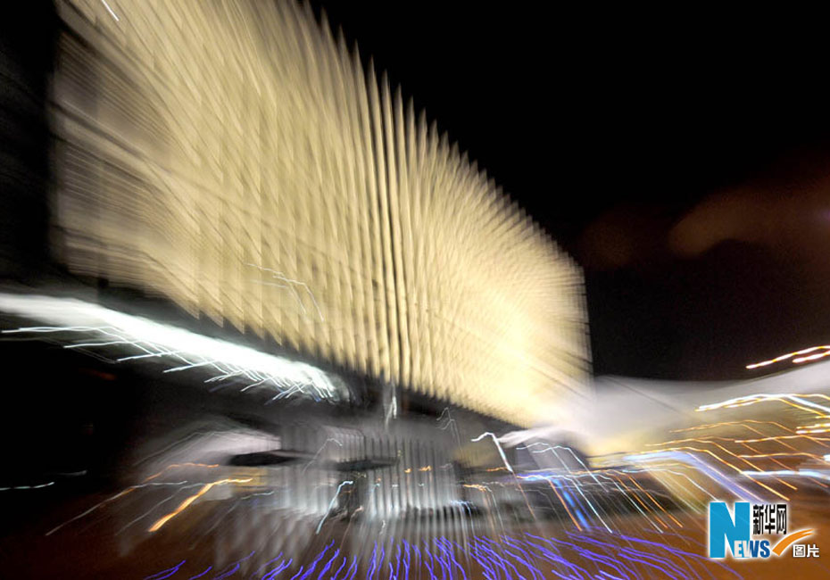 夜色下的世博園,迷離而夢幻。圖為媒體中心。圖片來源:新華網(wǎng) 郭毅攝
