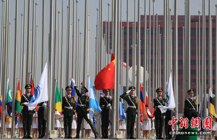 4月30日晚,舉世矚目的上海世博會(huì)開(kāi)幕式將在黃浦江畔世博園區(qū)舉行。圖為上海世博會(huì)在世博園區(qū)旗林廣場(chǎng)舉行升旗儀式,200多面旗幟展示了各參展方的風(fēng)采。中新社發(fā) 潘索菲 攝