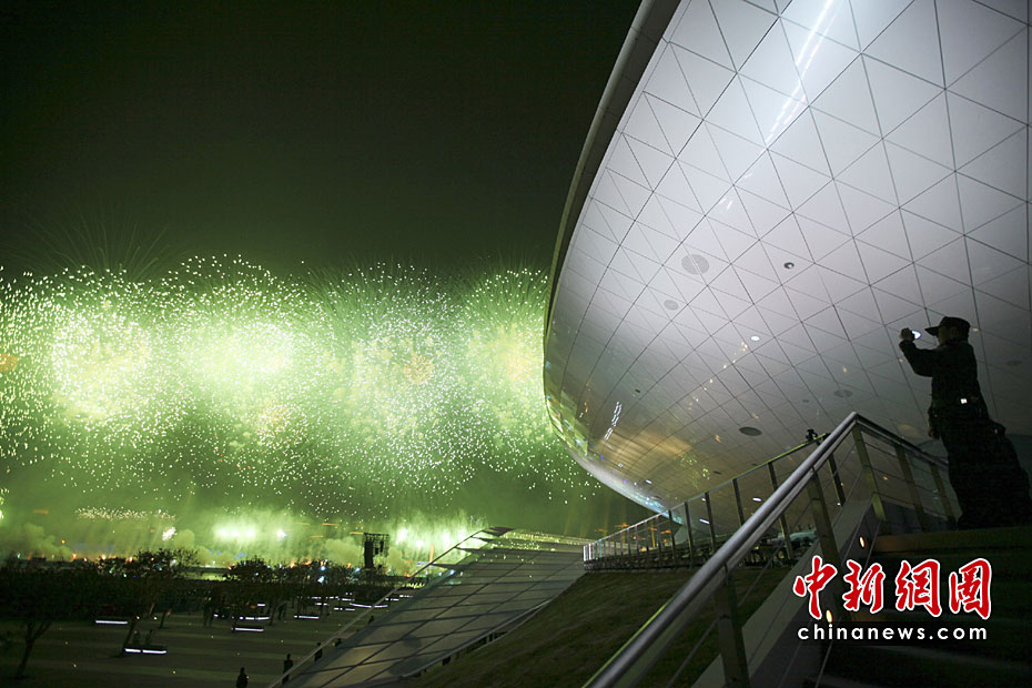4月30日晚21時28分,在世博會焰火燈光表演開始。萬千煙花爭奇斗妍,黃浦江兩岸綿延3.28公里同時奏響火樹銀花不夜天的華彩世博樂章。圖片來源:中國新聞網(wǎng)