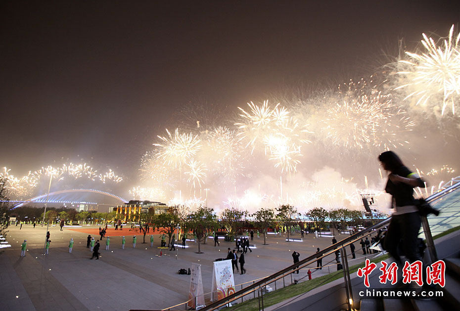 4月30日晚,2010年上海世博會開幕式在上海世博園世博文化中心舉行。21時28分,世博會焰火燈光表演開始。黃浦江兩岸綿延3.28公里同時奏響火樹銀花不夜天的華彩世博樂章。圖片來源:中國新聞網