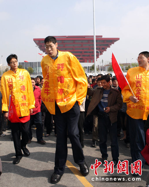 5月1日,三位平均身高2.30米以上的中國巨人到上海世博園區(qū)參觀中國館,吸引了眾多游客好奇的目光。當(dāng)日,上海世博會正式開園。中新社發(fā) 湯彥俊 攝