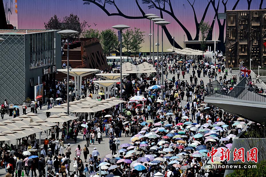 5月1日,2010上海世博園正式開園第一天,參觀者從浦東、浦西10多個(gè)出入口進(jìn)入園區(qū),世博園區(qū)內(nèi)游人如潮。圖片來(lái)源:中國(guó)新聞網(wǎng)