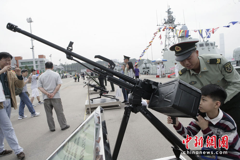為慶!拔逡弧眹(guó)際勞動(dòng)節(jié),進(jìn)一步增進(jìn)與香港社會(huì)各界相互溝通與交流,中國(guó)人民解放軍駐香港部隊(duì)5月1日開放了昂船洲軍營(yíng),共有約13000名市民前往參觀。圖為香港市民近距離參觀武器展示。中新社發(fā) 張勤 攝