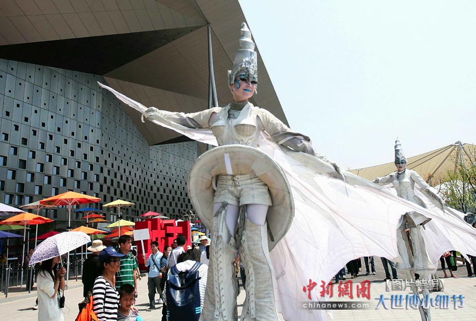 5月1日,上海世博會正式開園,當(dāng)日有20萬人次的游客參觀了世博園。世博首日,許許多多的小細(xì)節(jié)都帶給人一種全新的體驗。圖為荷蘭演員在上海世博園主題館前表演長腳舞。中新社發(fā) 袁云 攝